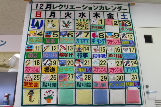 ご利用者様とスタッフが一緒に作った壁いっぱいのレクリエーションカレンダーです。